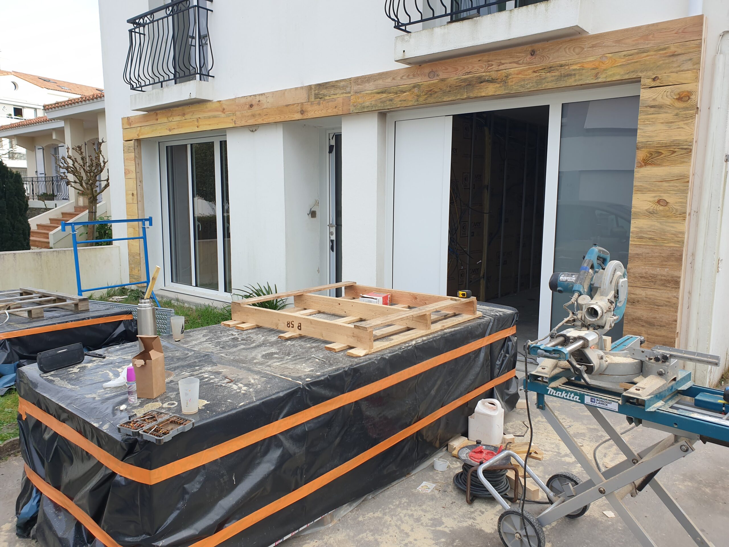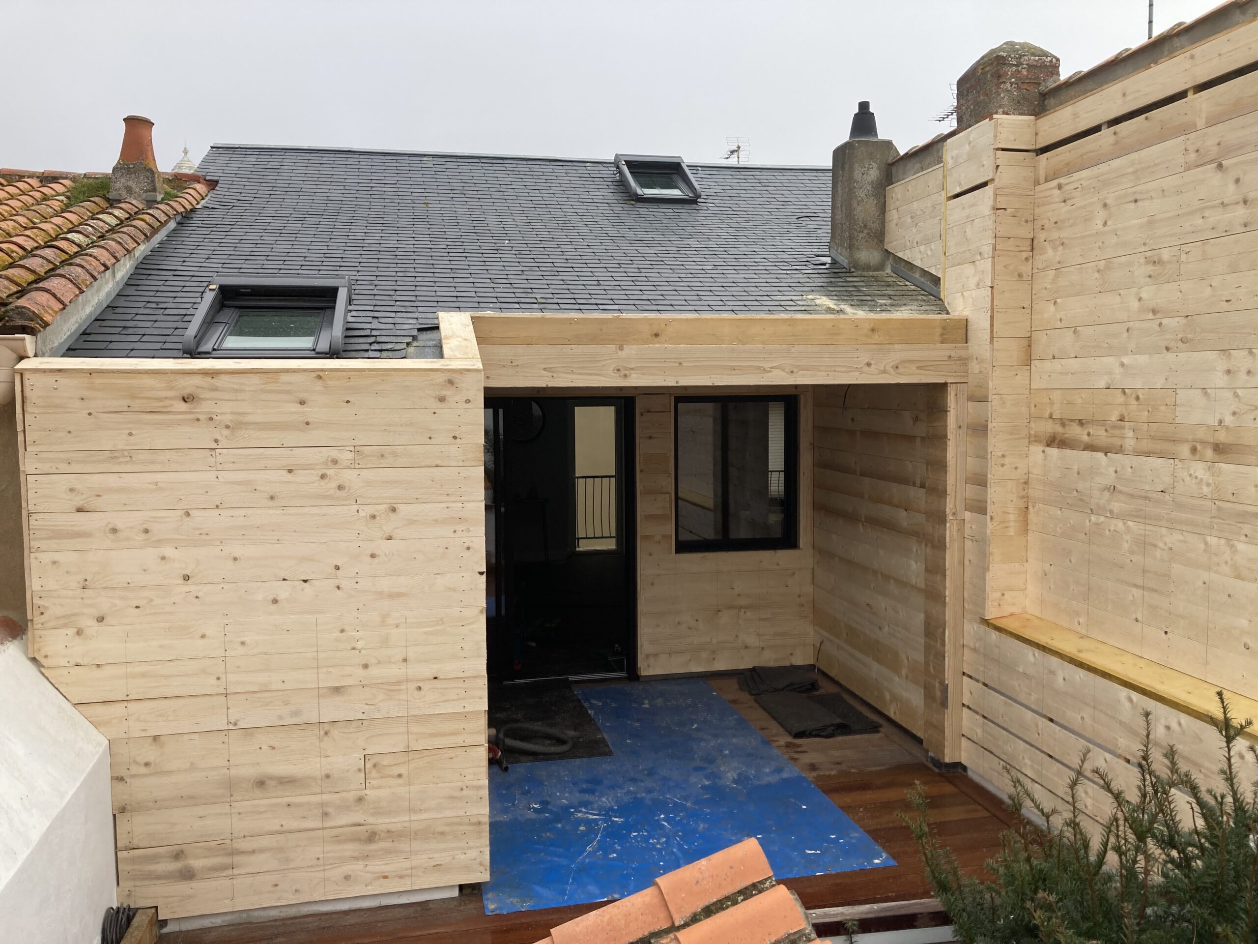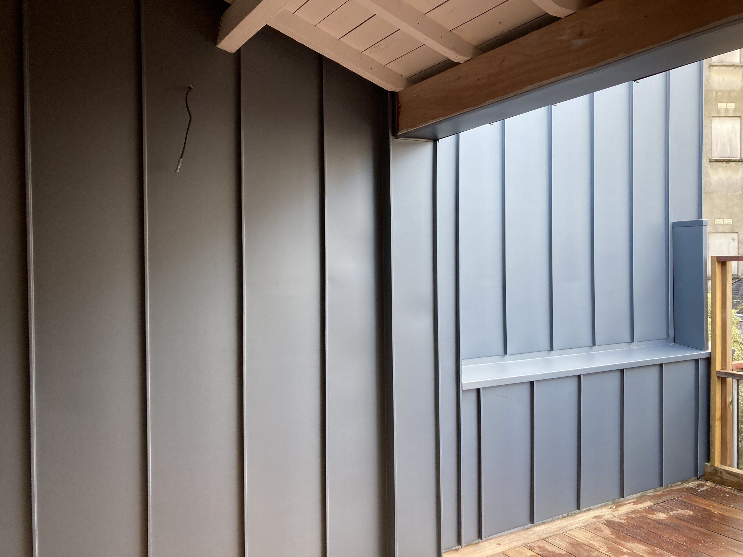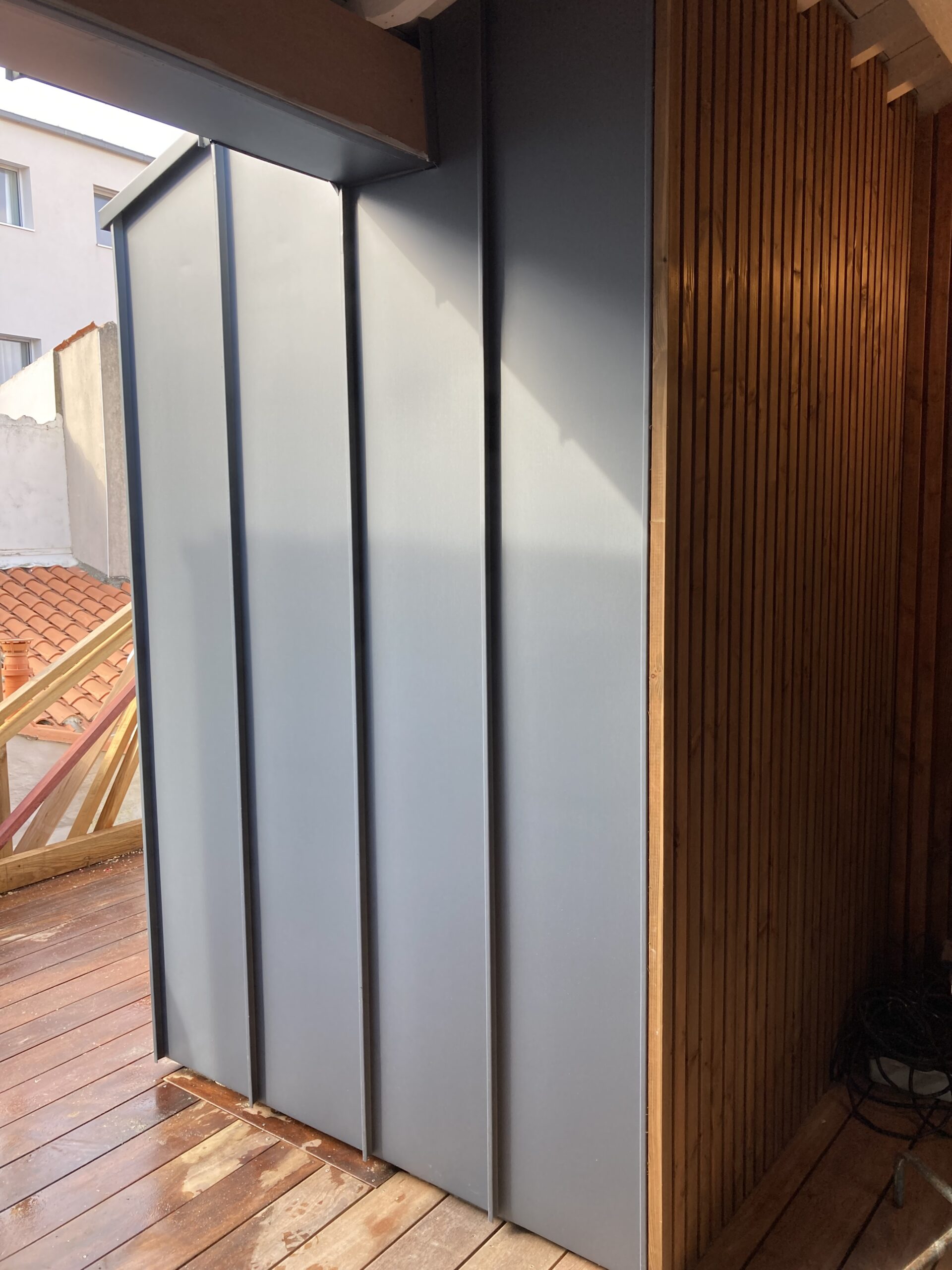 Création d’une terrasse avec un bardage en zinc pigmento bleu.