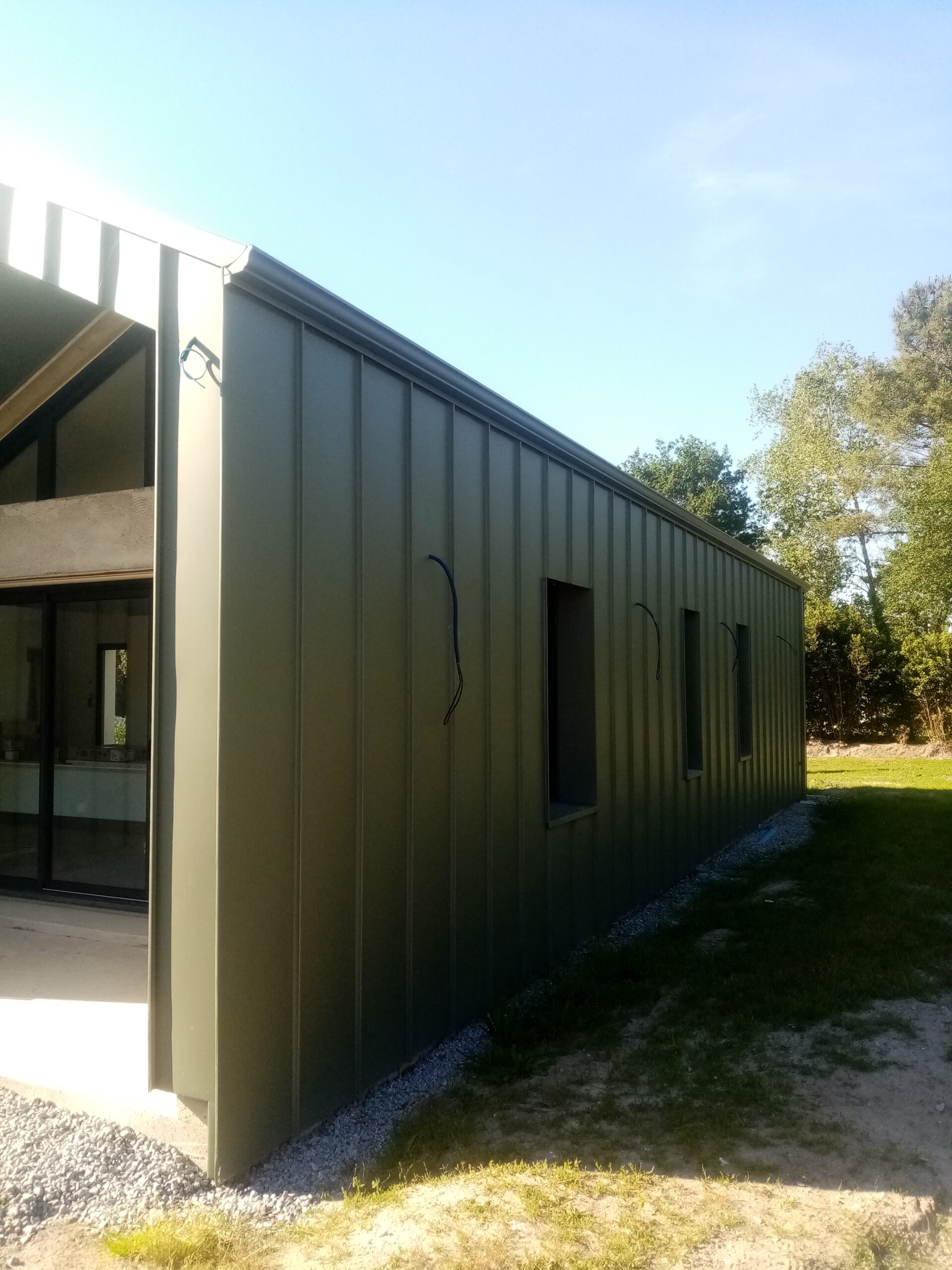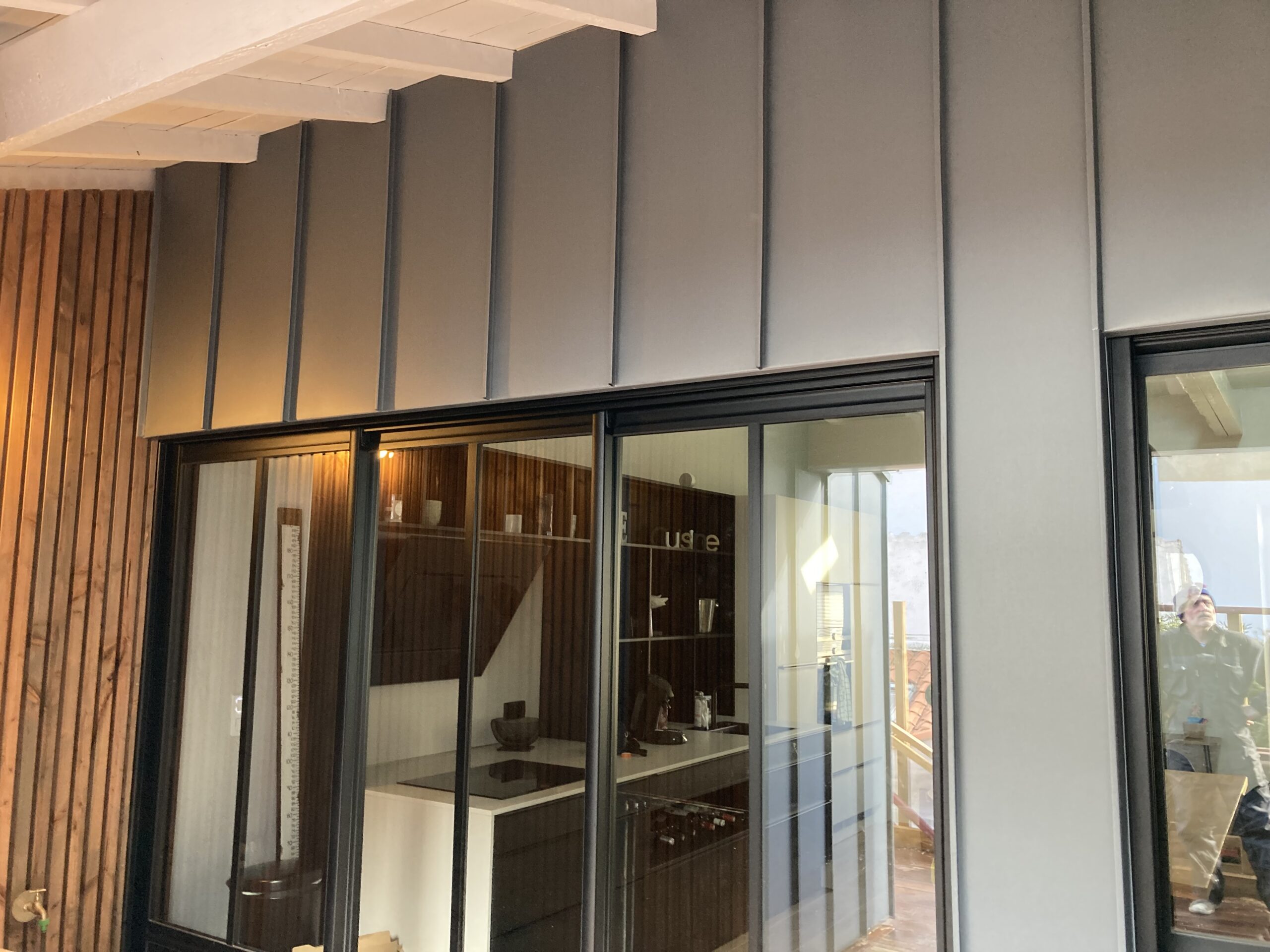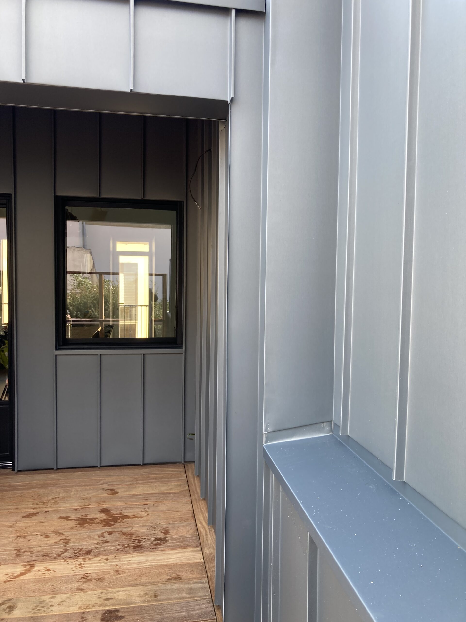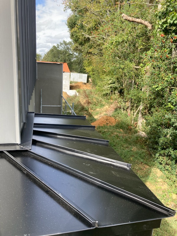Création d’un bardage en zinc skygrey en joint debout ainsi qu’un appui en aluminium noir.