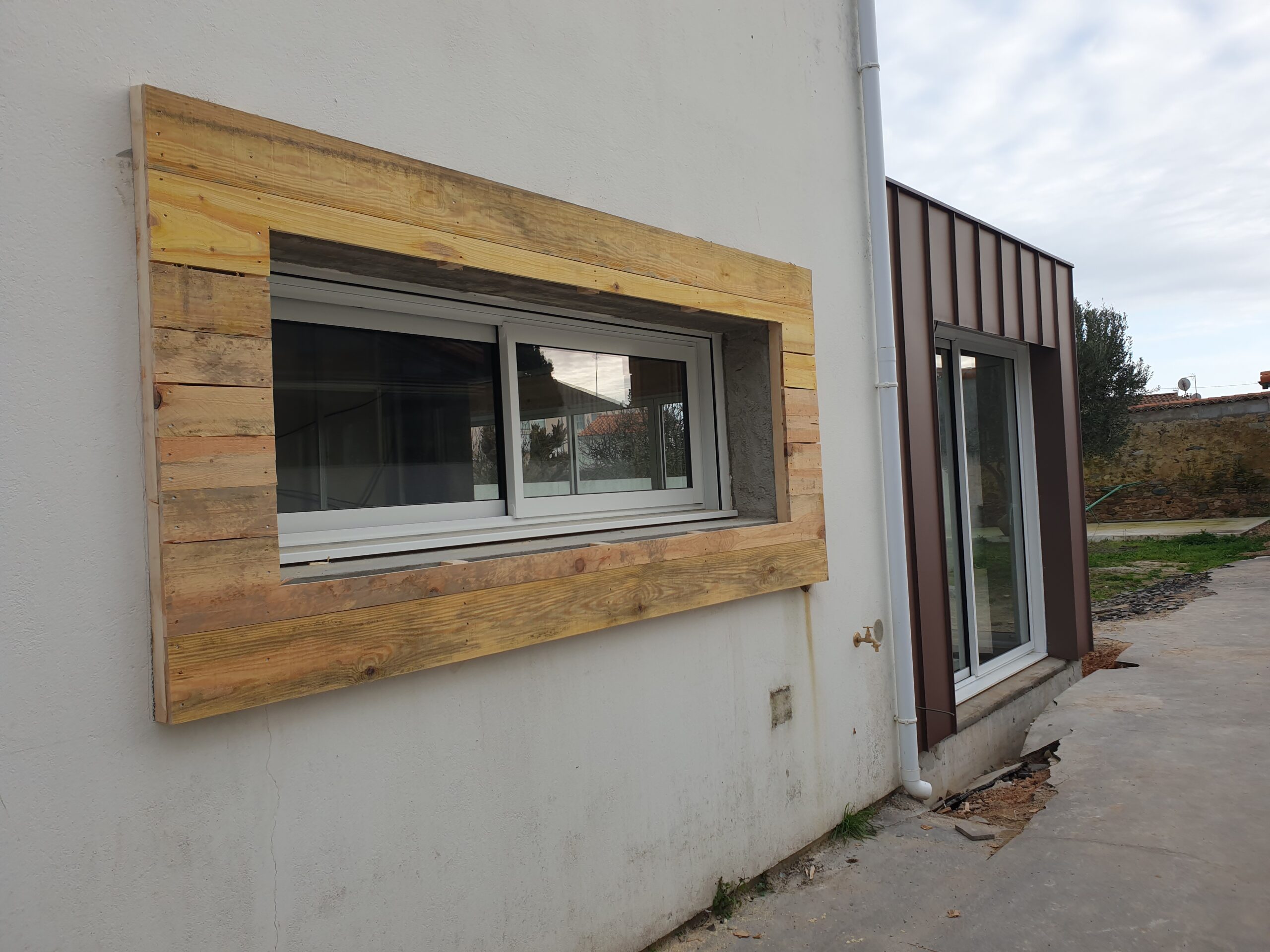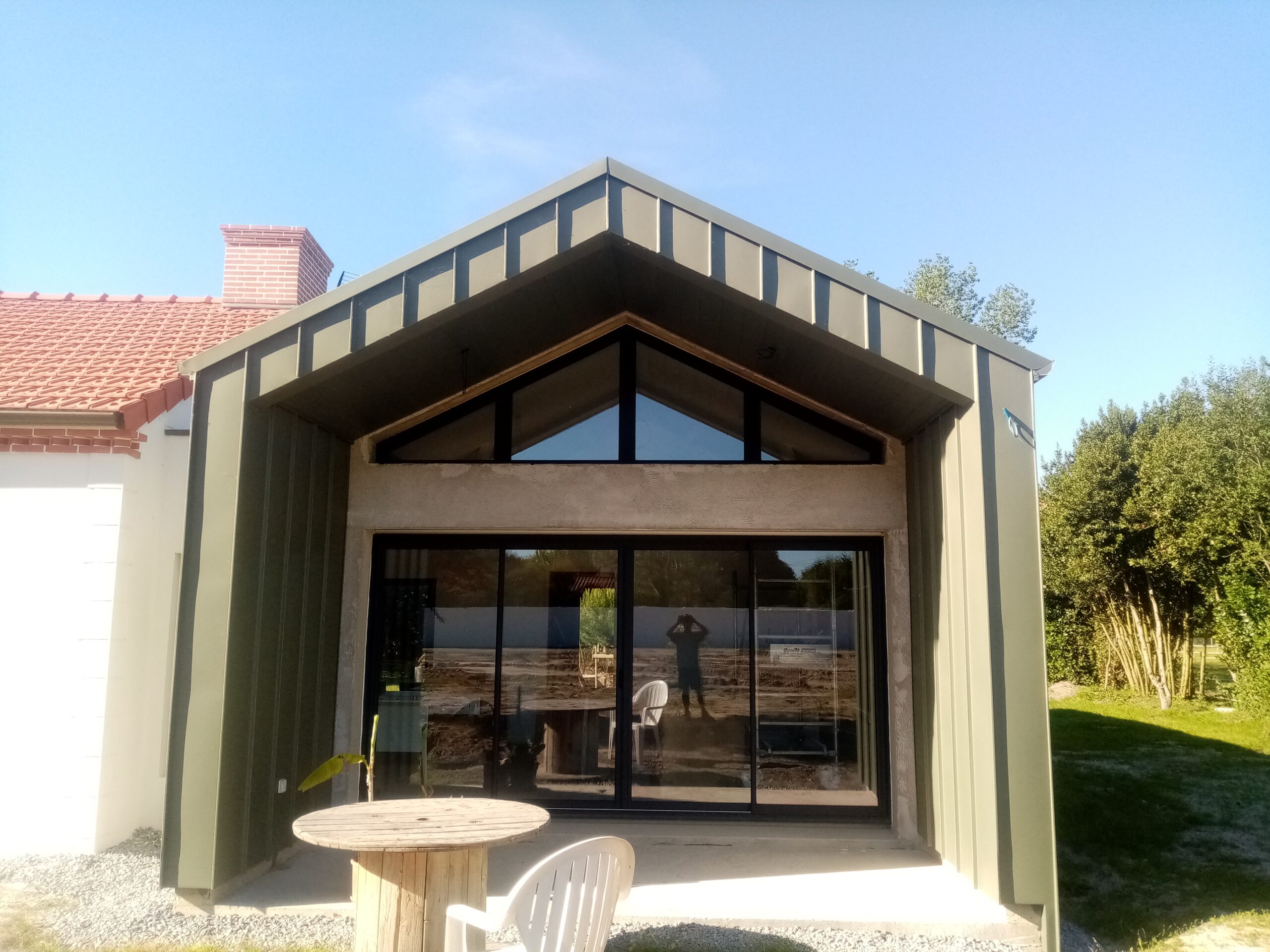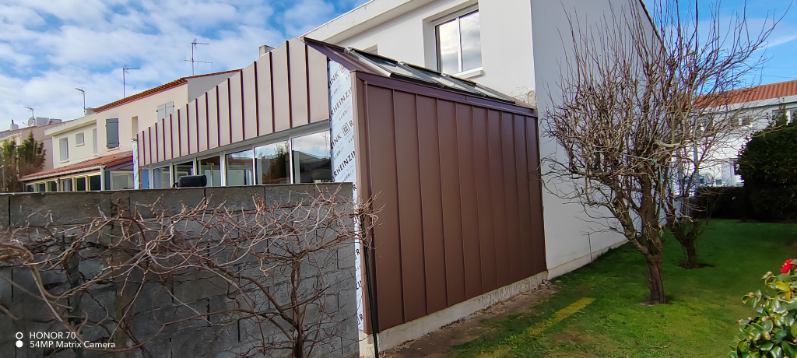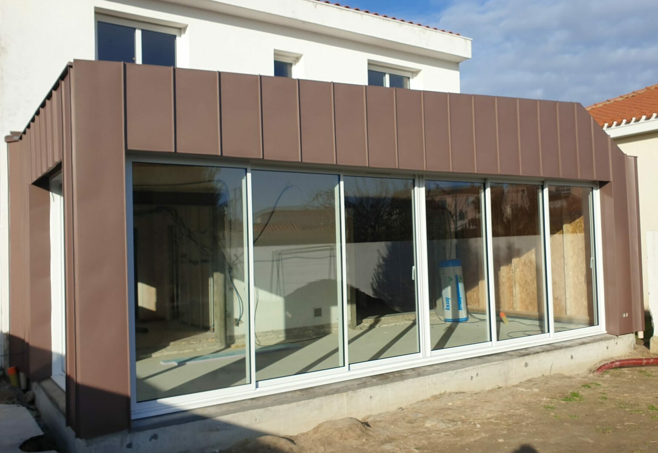 Création d’une extension avec un bardage et couverture en zinc pigmento rouge à joint debout et ses entourages de menuiserie.