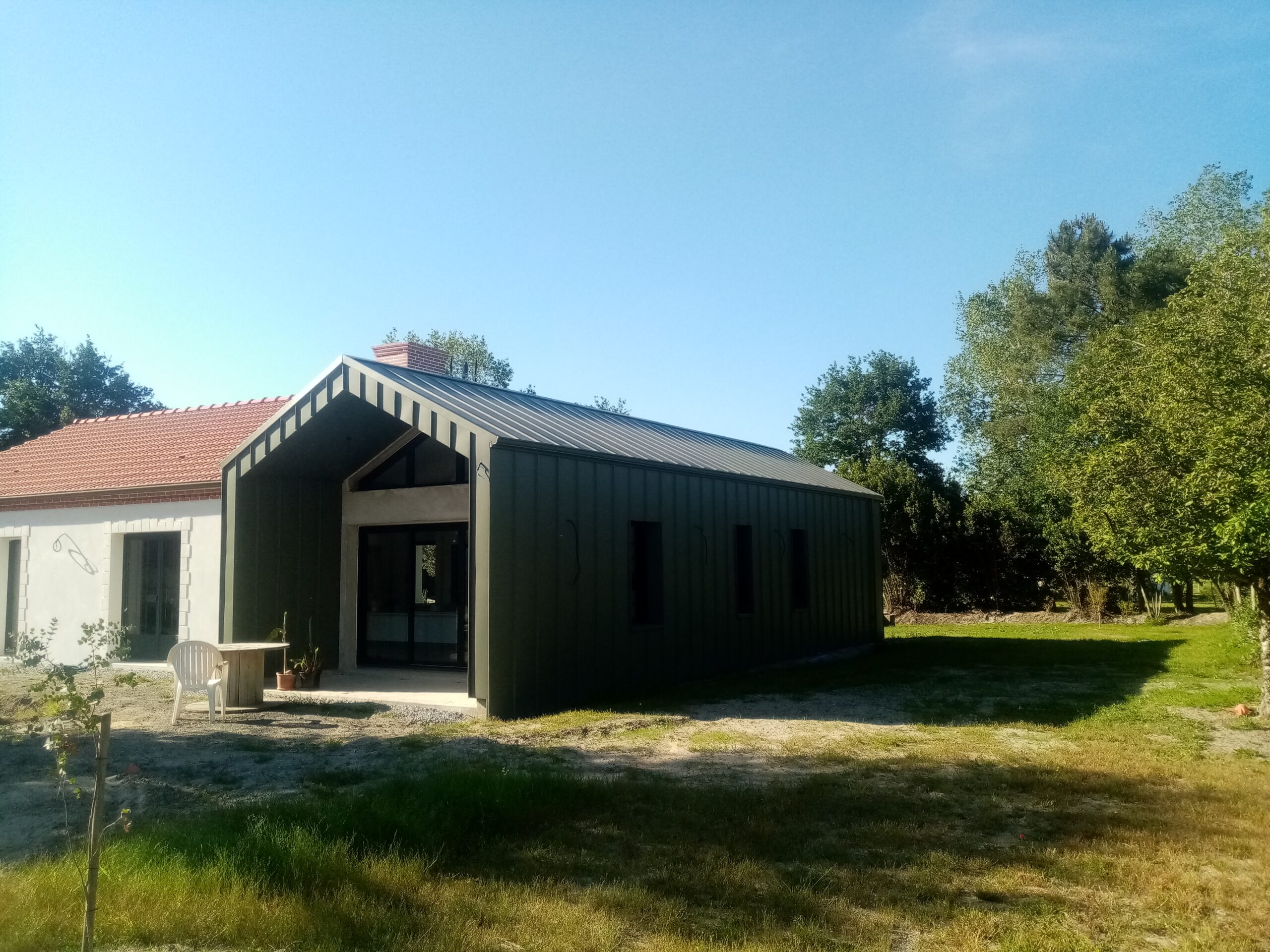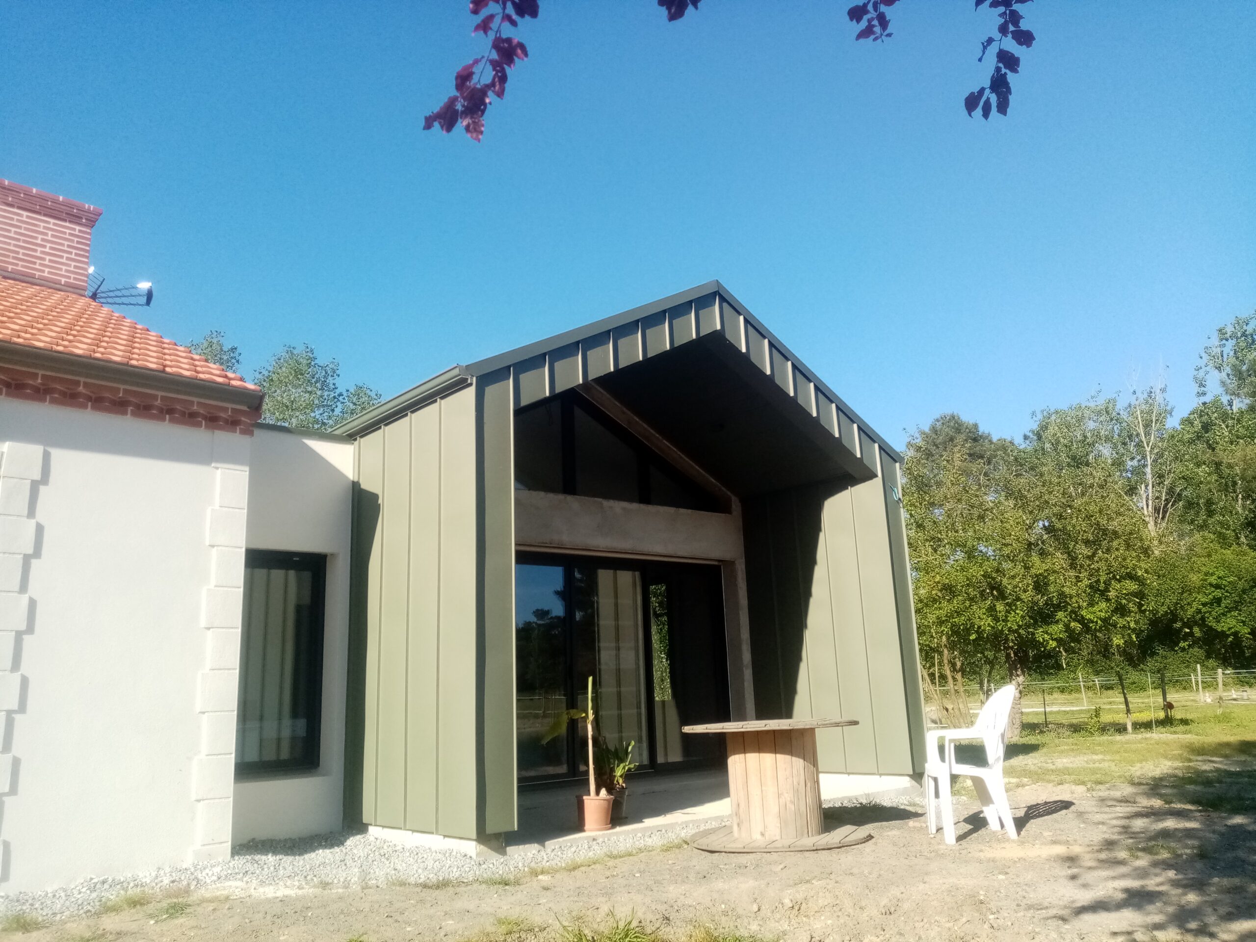 Création d’un agrandissement avec un bardage et couverture en zinc pigmento vert.